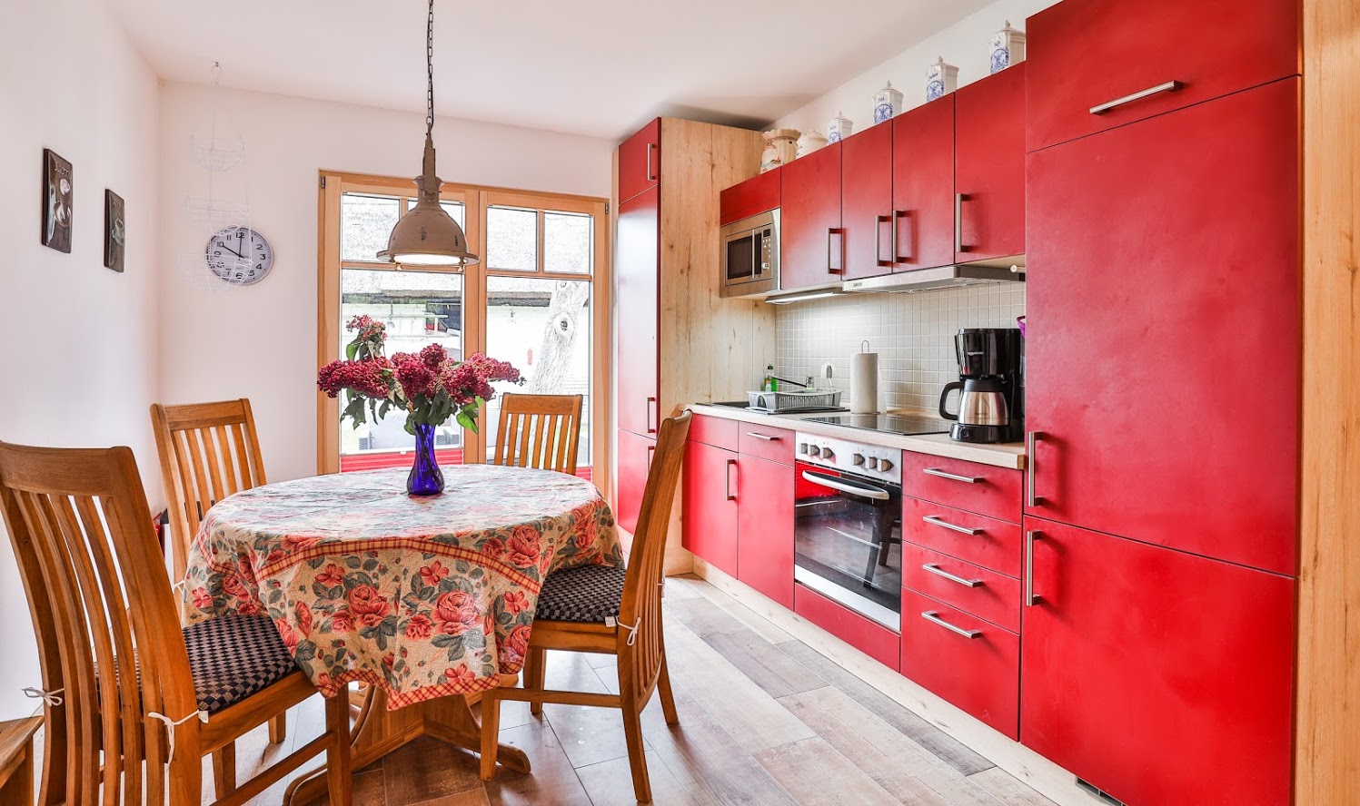 Küchenzeile mit Herd, Backofen, Kühlschrank, Tiefkühlschrank, Geschirrspülmaschine, Mikrowelle, Kaffeemaschine, Toaster, Wasserkocher